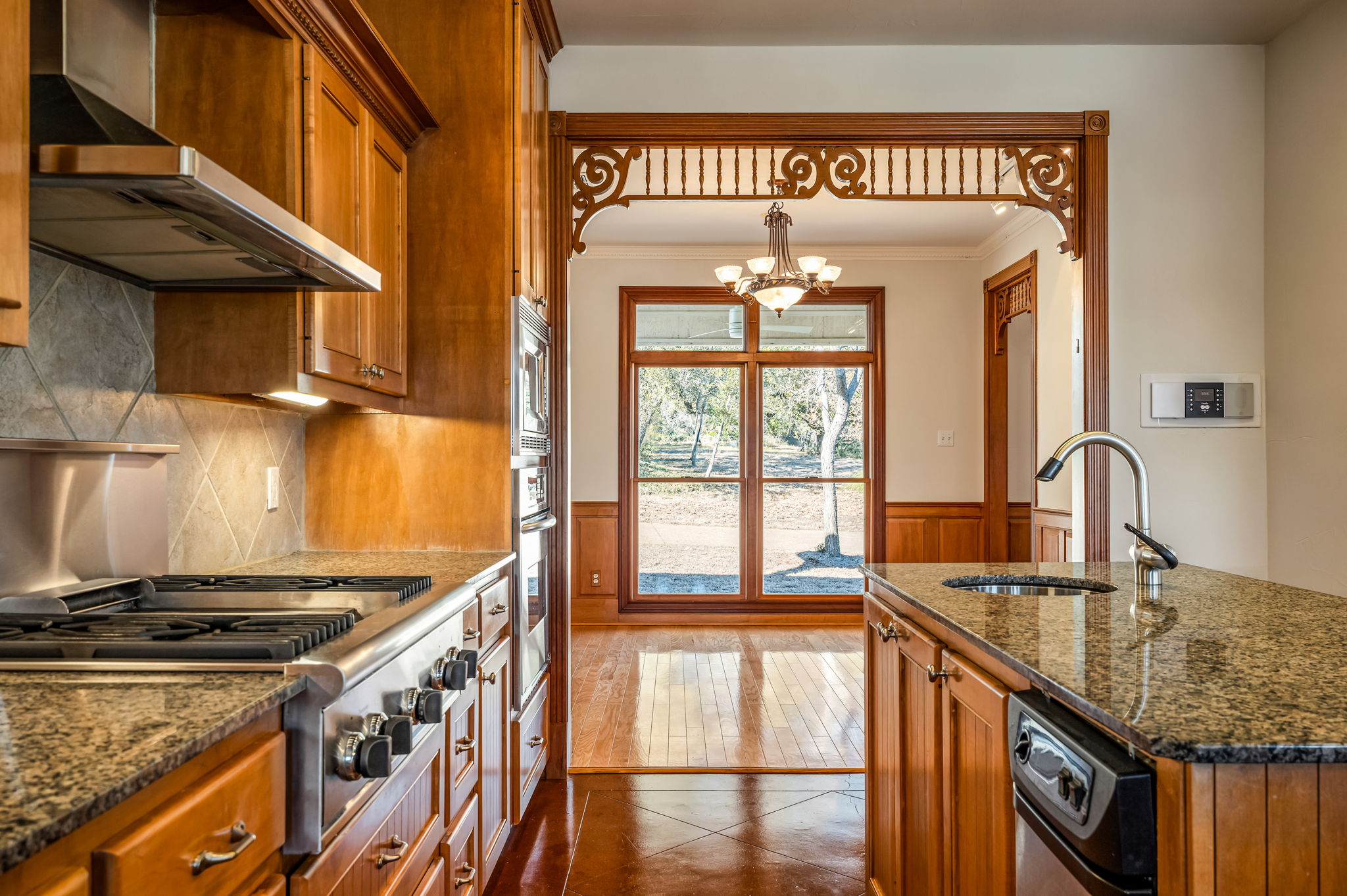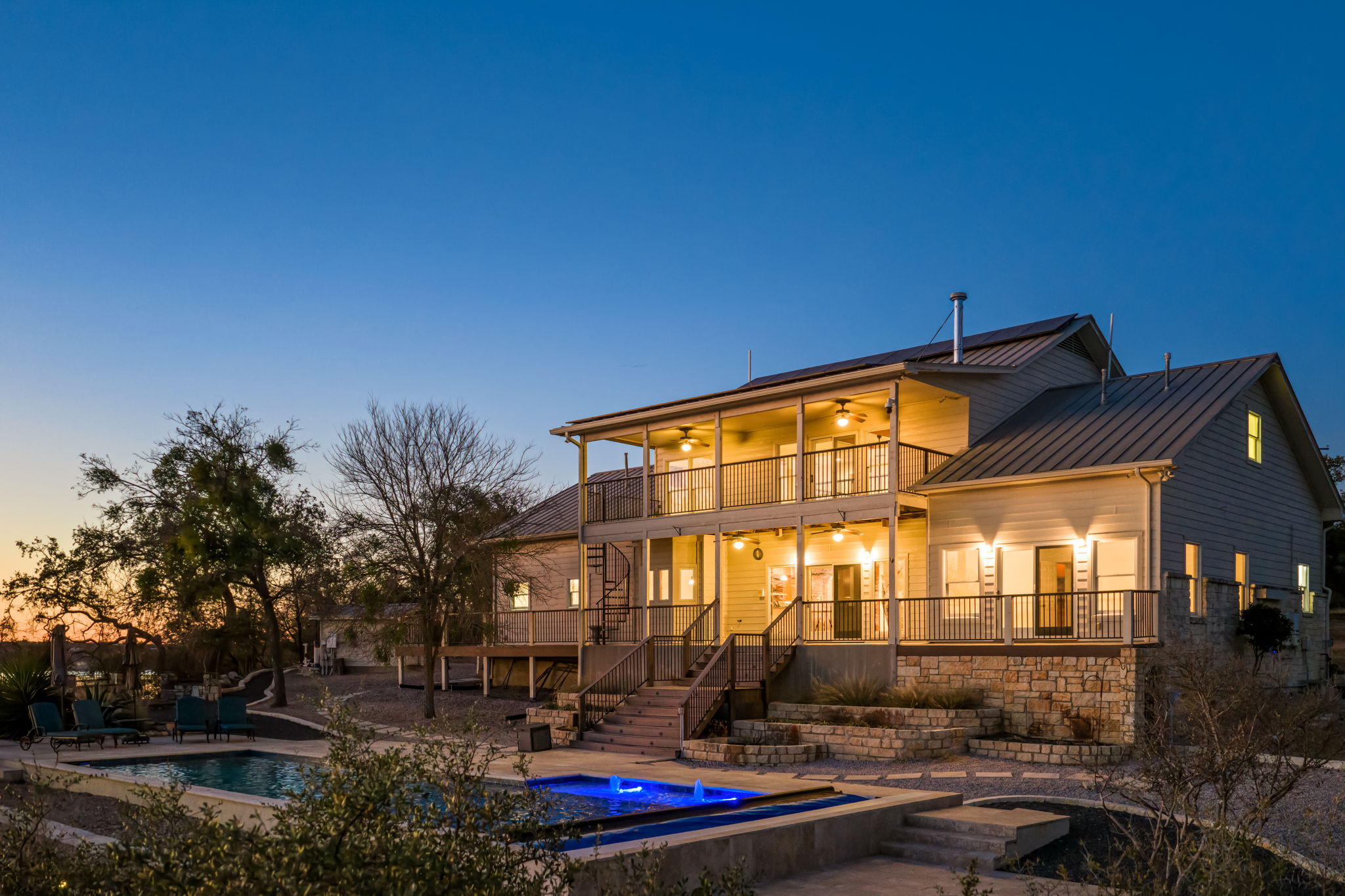 The north–south facing custom residence was designed for both efficiency and comfort, featuring a standing-seam metal roof and extensive infrastructure upgrades that contribute to long-term performance and lower utility costs. These include a geothermal heat pump, tankless water heaters, solar panels, and a backup battery system.