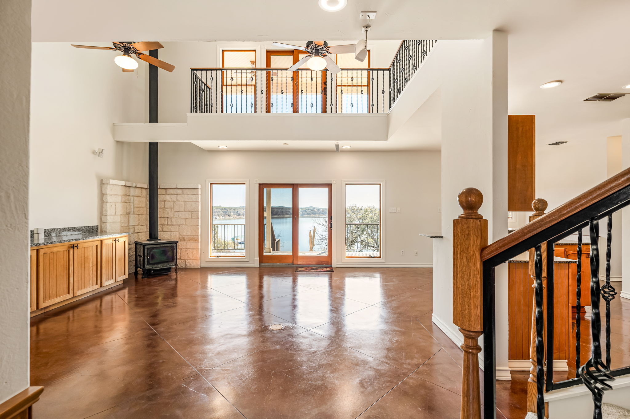 Upstairs, a second living area with unobstructed lake views is accompanied by three additional bedrooms and a full bathroom, creating a flexible and comfortable layout for family or guests. In total, the residence includes four bedrooms and three bathrooms.